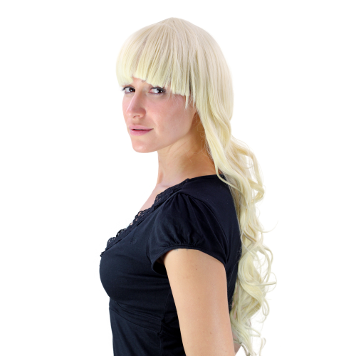 Prachtige lange gegolfde lichtblonde pruik met pony. Kanekalon uitvoering. Instelbaar en wasbaar. Meet wasvoorschrift
