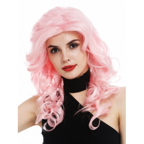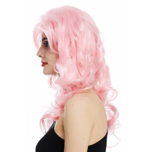 NIEUW: Prahtige gegolfde en getoupeerde pruik in licht rose. Lengte 45 cm.Met haakjessluiting, dus instelbaar, wasbaar. Kanekalon kwaliteit. Met wasvoorschrift.