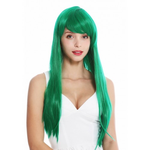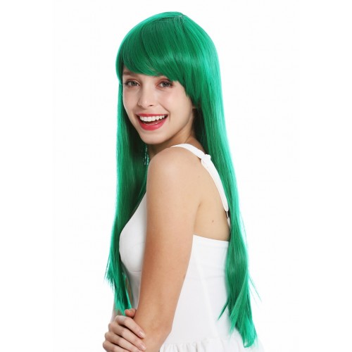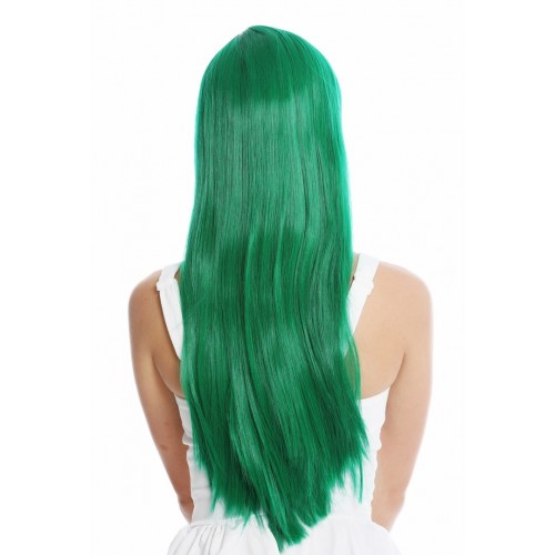 NIEUW: Prachtige lange gladde pruik met pony. Kleur groen. Lengte 60 cm.Met haakjessluiting, dus instelbaar, wasbaar. Kanekalon kwaliteit. Met wasvoorschrift.