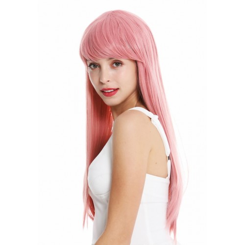 NIEUW: Prachtige lange gladde pruik met pony. Kleur pastel rose. Lengte 60 cm.Met haakjessluiting, dus instelbaar, wasbaar. Kanekalon kwaliteit. Met wasvoorschrift.