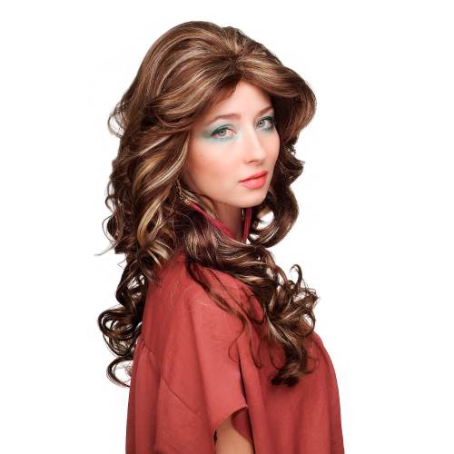 Prachtige halflange damespruik in bruine/blond en coupe soleil. Grove krul. Lengte ca. 55 cm. Hoogwaardige kwaliteit. Tot ca. 60 cm. hoofdomvang. Licht. Luchtdoorlatend.Japanse kunstvezel. Met haakjessluiting. Was- en onderhoudsvoorschrift bijgevoegd.