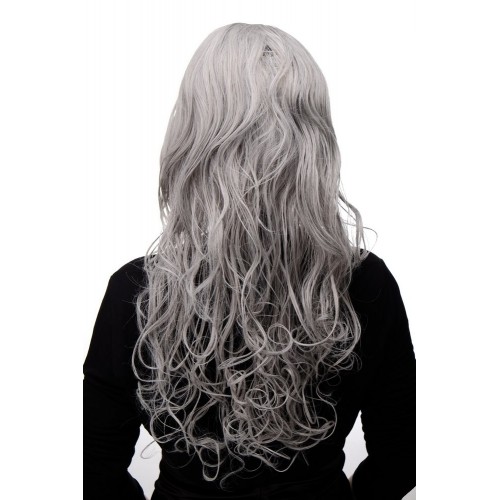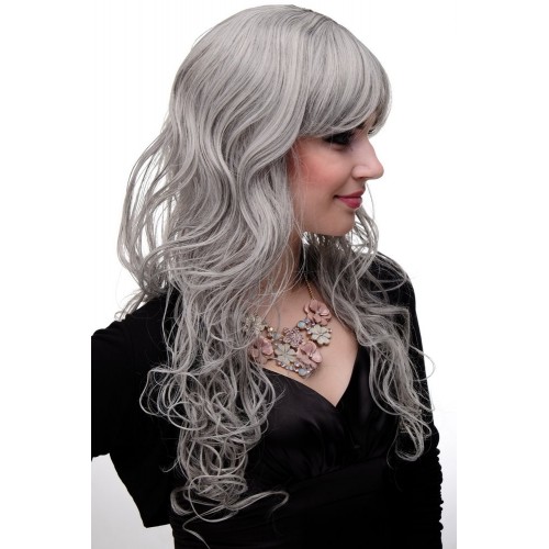 Lange damespruik in zilvergrijs met zwarte accenten en grove krul. Lengte ca. 60 cm. Hoogwaardige kwaliteit. Tot ca. 60 cm. hoofdomvang. Licht. Luchtdoorlatend.Japanse kunstvezel. Met haakjessluiting. Was- en onderhoudsvoorschrift bijgevoegd.